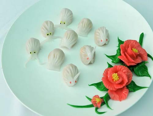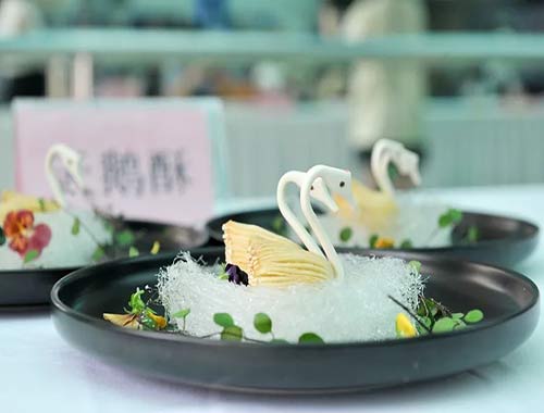 深圳會場鵬城技師學(xué)院師生制作雙色龍蝦球、紅燒光明乳鴿、脆皮炸仔雞、南澳海膽炒飯、香煎沙井金蠔、天鵝榴蓮酥、五色蝦餃等經(jīng)典粵菜粵點。