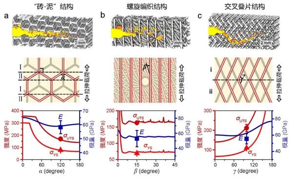 圖3:具有不同仿生結(jié)構(gòu)的鎂-鈦復(fù)合材料中的裂紋擴(kuò)展形貌、結(jié)構(gòu)模型及其強(qiáng)度和模量與特征角度之間的定量關(guān)系