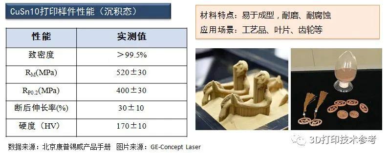 CuSn10作為一種鑄造錫青銅易于成型,很多涉及銅材料的模型或工藝品打印選用CuSn10材料。CuSn10合金強(qiáng)度較高,耐磨和耐腐蝕性能優(yōu)良,可以用于制造葉片、齒輪等耐磨零件,但其導(dǎo)電導(dǎo)熱性能不高,因此對于有導(dǎo)電或?qū)嵋笠话悴贿x用CuSn10。CuSn10屬于目前增材制造銅合金材料中的常規(guī)產(chǎn)品。