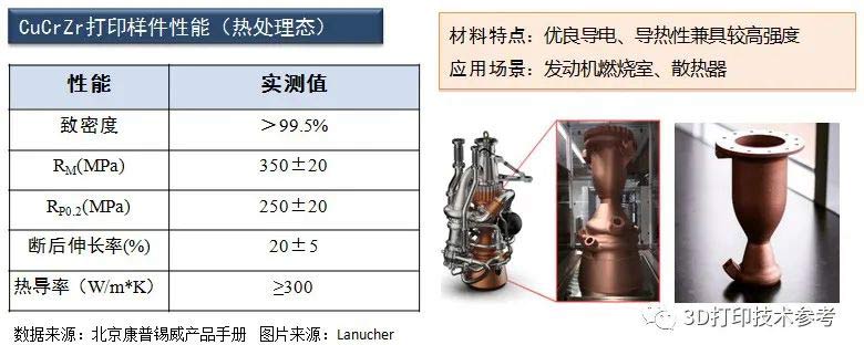 目前許多國外知名增材制造廠家已經(jīng)將銅材料納入到自己的產(chǎn)品目錄當(dāng)中。比較有代表性的是EOS在2020年公布了純Cu和CuCrZr的數(shù)據(jù)手冊,2021年又推出兩類材料的AMCM(EOS旗下子公司,生產(chǎn)定制設(shè)備,Additive Manufacturing Customized Machine)版本。SLM Solutions陸續(xù)上線CuSn10、CuCrZr產(chǎn)品數(shù)據(jù),2019年該公司推出兼顧強(qiáng)度和導(dǎo)電導(dǎo)熱性的CuNi2SiCr產(chǎn)品,可用于模具和電氣領(lǐng)域,成為增材制造銅合金材料中一項(xiàng)重磅產(chǎn)品。材料廠家TLS Technik、m4p、Sandvik、Makin等公司都公布有自己的增材制造銅合金產(chǎn)品。目前增材制造用銅及銅合金材料集中于純Cu、CuSn10、CuCrZr和CuNi2SiCr,雖然CuNiSn、CuCr、CuCrNb、CuAlFeNi等材料也有相關(guān)增材制造研究與應(yīng)用,但應(yīng)用程度還不及前四類產(chǎn)品。有研粉末新材料股份有限公司(簡稱“有研粉材”,股票代碼688456)是國內(nèi)最大的銅粉供應(yīng)商,年銷售各類銅及銅合金粉末超3萬噸,旗下子公司北京康普錫威在國內(nèi)較早開展了增材制造用銅及銅合金粉末的研究與應(yīng)用,目前已形成較全系列的增材制造專用銅及銅合金粉末產(chǎn)品,包括純Cu、CuSn10、CuCrZr、CuNi2SiCr、CuAlFeNi等,在航空航天、模具、電氣等領(lǐng)域取得了重要應(yīng)用。